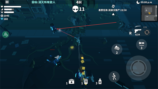 1、操控角色移动并瞄准剩余丧尸,用枪械持续攻击,推进消灭所有敌人目标,同时留意悬赏任务进度。