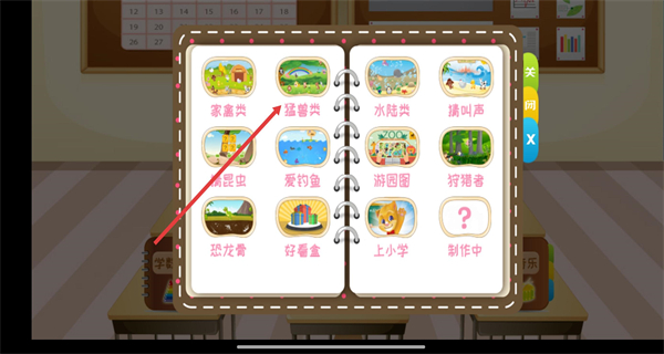 2、进入教室场景,选择点击学动物笔记本,进入查看动物学习分类页。