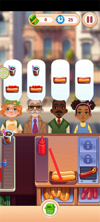 1、进入餐食制作界面后,根据顾客需求,点击对应食材如热狗完成基础餐品的组装,满足订单。