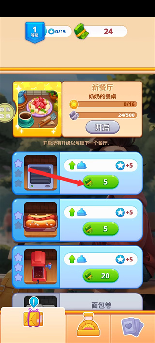 4、积累足够资源后,在升级界面点击设施升级按钮如烤箱升级,提升餐食制作的效率与种类。
