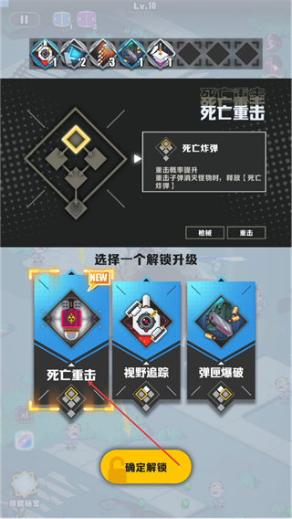 4、升级后选择死亡重击解锁新技能,点击确定解锁,增强战斗能力。