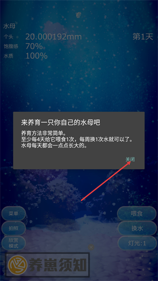 1、查看养崽须知的提示,了解养育水母需至少每4天喂食1次、每周换水1次,点击关闭按钮关闭提示框,即可开始进行水母的养育操作。