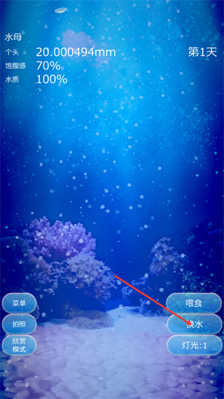 2、在水母养育界面,点击右侧的换水按钮,可完成水质的更换,维持水母生存环境的清洁,这是养育水母的必要操作之一。