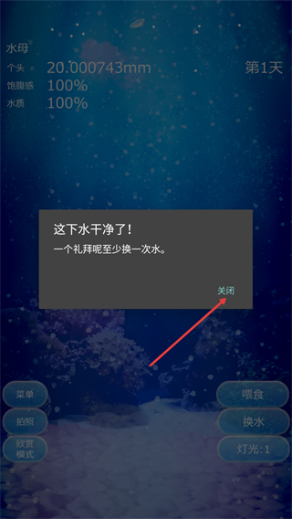 3、完成换水后,界面弹出这下干净了!一个礼拜至少换一次水的提示,点击关闭按钮关闭提示,继续进行水母的其他养育操作。