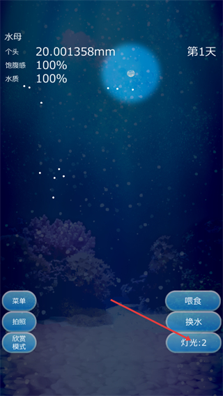 4、点击右侧的灯光按钮,可调整养殖环境的灯光效果,当前灯光等级升至2,合适的灯光有助于营造水母舒适的生存环境。