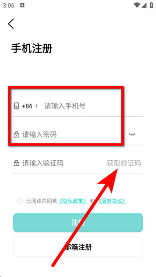 3、在手机注册页面,输入手机号和密码,点击获取验证码。