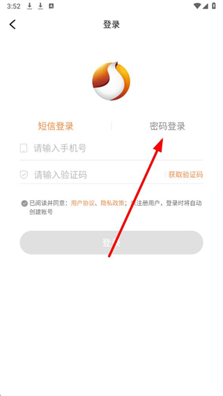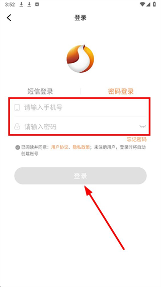 4、在对应输入框填写手机号和密码,确认协议已勾选后点击登录,完成账号密码登录。