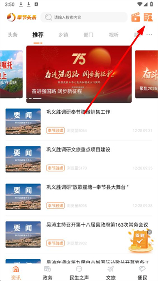 1、在奉节头条app首页右上角,找到个人中心入口并点击,进入个人相关页面。