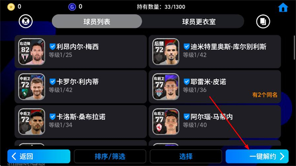 4、在球员列表页面,点击右下角的一键解约,进入批量解约界面。