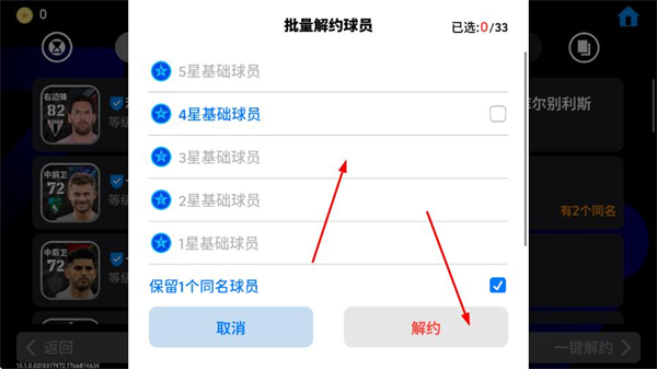 5、在批量解约界面,选择要解约的球员星级(如4星基础球员),确认选择后点击“解约”按钮,完成球员解约操作。