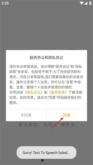 1、打开麦田商旅车主端出现协议弹窗,阅读内容后点击同意按钮进入软件。