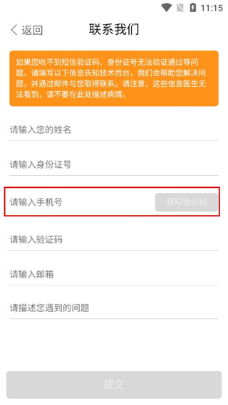 2、进入联系我们页面后,先填写手机号并获取、输入验证码。