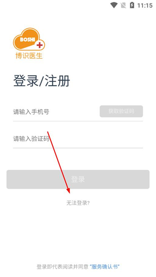 1、在博识医生的登录/注册页面,点击无法登录选项。