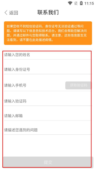 3、依次填写姓名、身份证号、邮箱,描述登录遇到的问题后,点击提交。