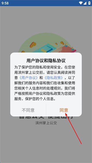 1、打开滨州掌上公交,查看弹出的用户协议和隐私协议内容,点击界面中的同意按钮。
