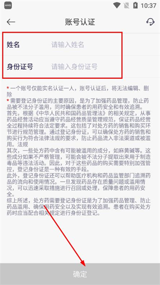 3、在账号认证界面填写姓名、身份证号,完成后点击确定,即可完成账号认证。