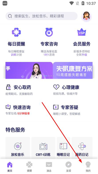 1、打开好睡眠365APP,在首页特色服务板块中点击CBT-I训练选项。
