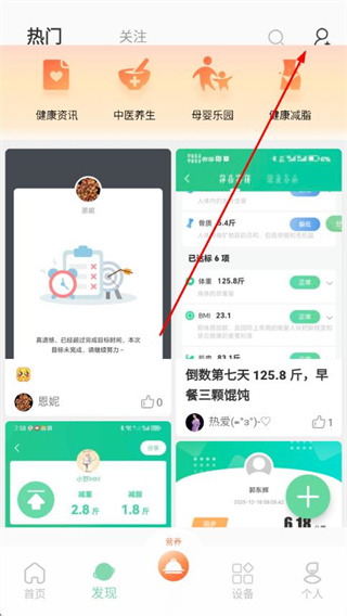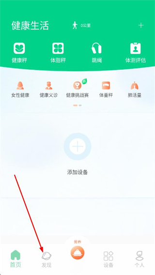 1、 打开好体知体脂秤app的首页,点击底部发现,进入发现页面。