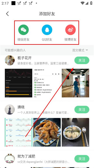 3、 选择通过微信/QQ/微博好友渠道添加,或点击可能感兴趣的人旁的关注,添加好友。